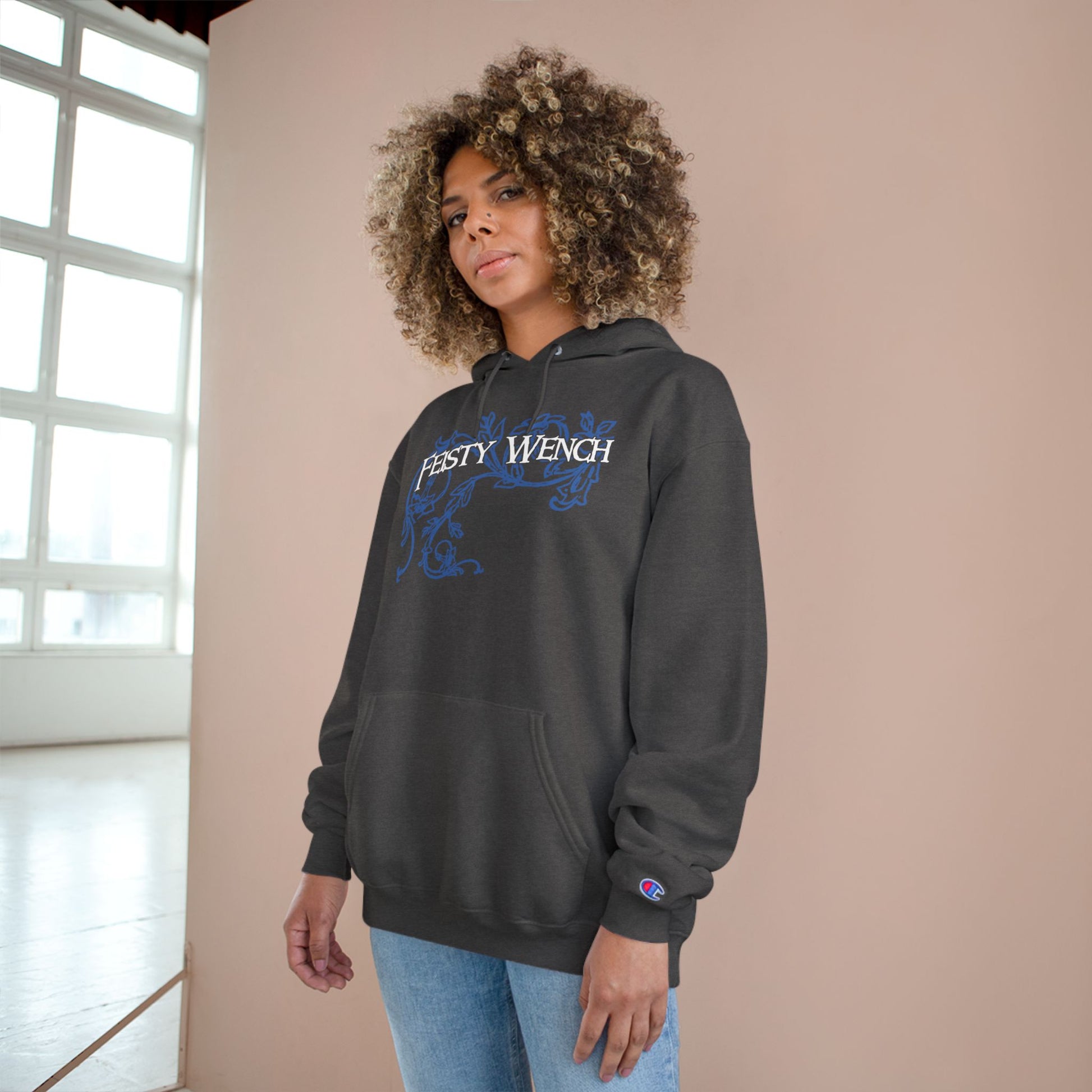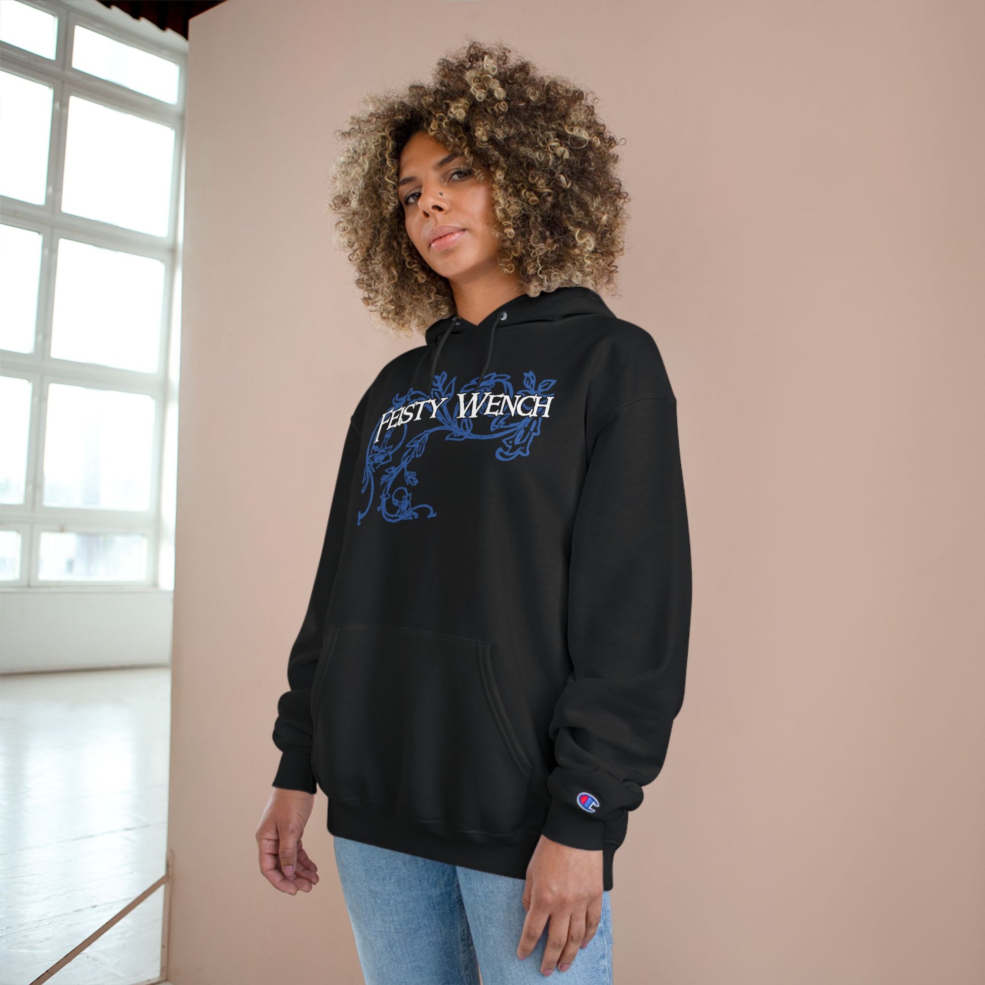 A custom Champion Hoodie featuring a design inspired by the St. Louis Renaissance festival Feisty Wench. This medium-heavy, warm, and cozy hoodie is made from 50% cotton and 50% polyester, with a spacious kangaroo pouch pocket and an adjustable hood with drawstrings. Perfect for those who enjoy Renaissance fairs and festivals, this hoodie is great for adding a touch of whimsy to everyday outfits or for cosplay events.